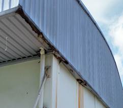 ระบบระบายน้ำที่ไม่มีประสิทธิภาพเป็นอีกหนึ่งสาเหตุหลักของปัญหาหลังคารั่ว เมื่อรางน้ำฝนมีใบไม้ ขยะ หรือตะกอนสะสมจนเกิดการอุดตัน น้ำฝนจะไม่สามารถไหลลงได้ตามปกติ ทำให้น้ำขังและล้นเข้าหาตัวอาคาร น้ำที่ล้นจากรางอาจย้อนเข้าไปตามแนวต่อระหว่างหลังคากับผนัง ซึมผ่านยาแนวที่เสื่อมสภาพ และรั่วซึมเข้าภายในโรงงานได้ นอกจากนี้ รางน้ำที่ชำรุด แตกร้าว หรือหลุดจากตำแหน่งยังทำให้น้ำไหลกระเด็นไปยังผนังอาคารและฐานราก ซึ่งอาจส่งผลกระทบต่อโครงสร้างในระยะยาว การตรวจสอบและทำความสะอาดรางน้ำอย่างน้อยปีละ 2 ครั้ง โดยเฉพาะก่อนและหลังฤดูฝน จะช่วยให้ระบบระบายน้ำทำงานได้อย่างมีประสิทธิภาพและป้องกันปัญหาการรั่วซึมได้